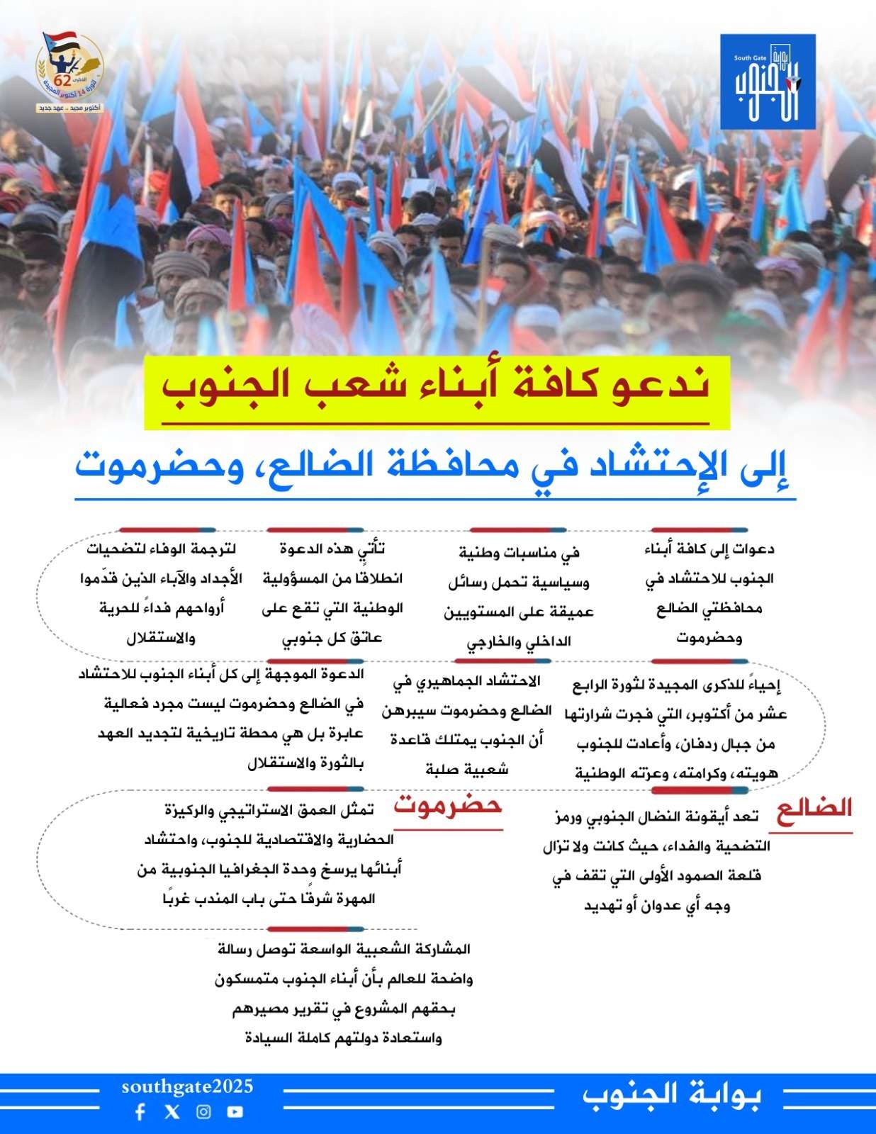 تشهد محافظات الجنوب استعدادات وتحضيرات كبيرة يصاحبها حراكاً جماهيريا لشعب الجنوب قاطبة من المهرة شرقاً ومضيق باب المندب غرباً للاحتفال بالذكرى الـ 62 لثورة الـ 14 اكتوبر المجيدة التي انتصر فيها الجنوب...